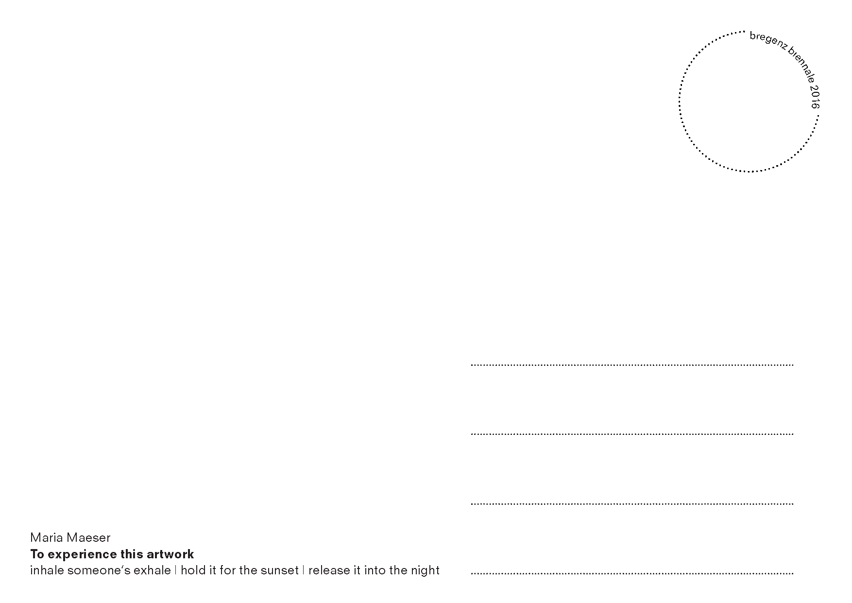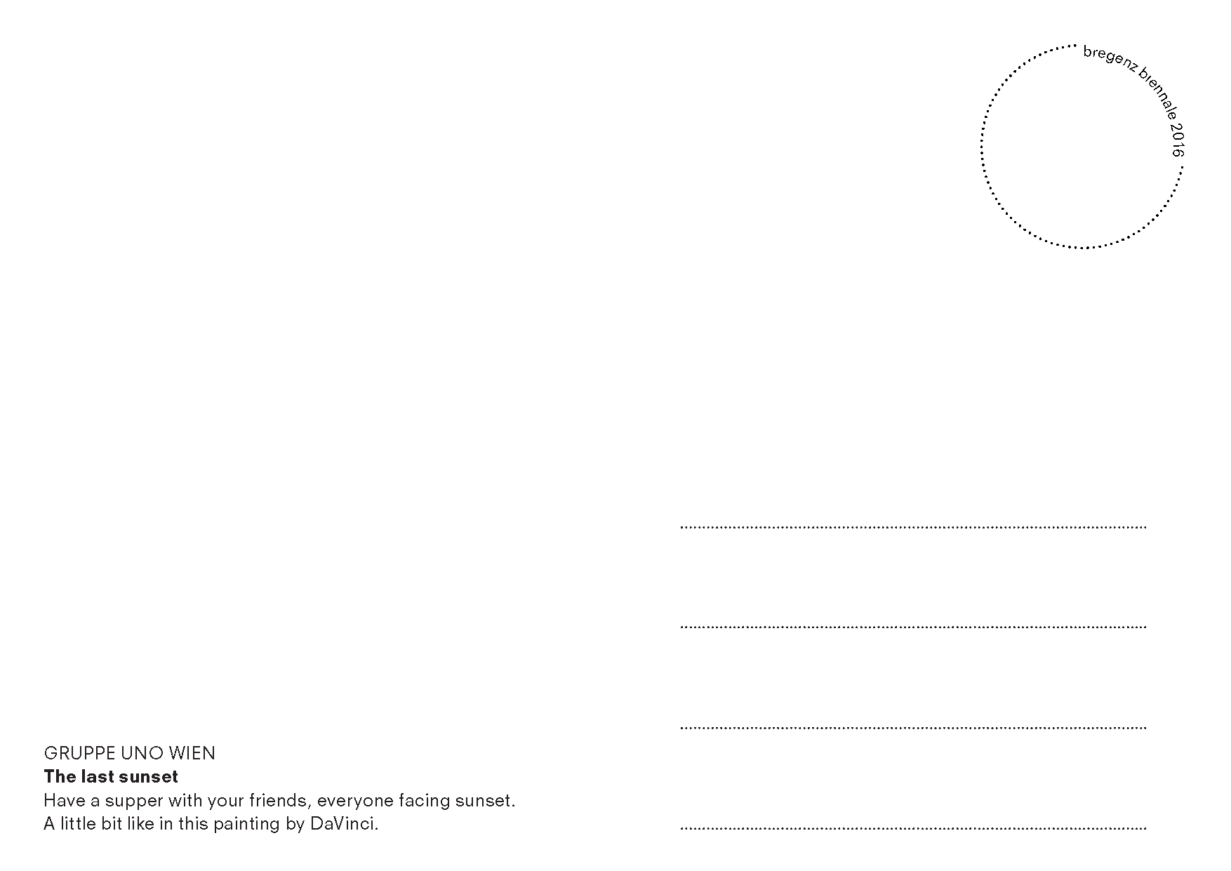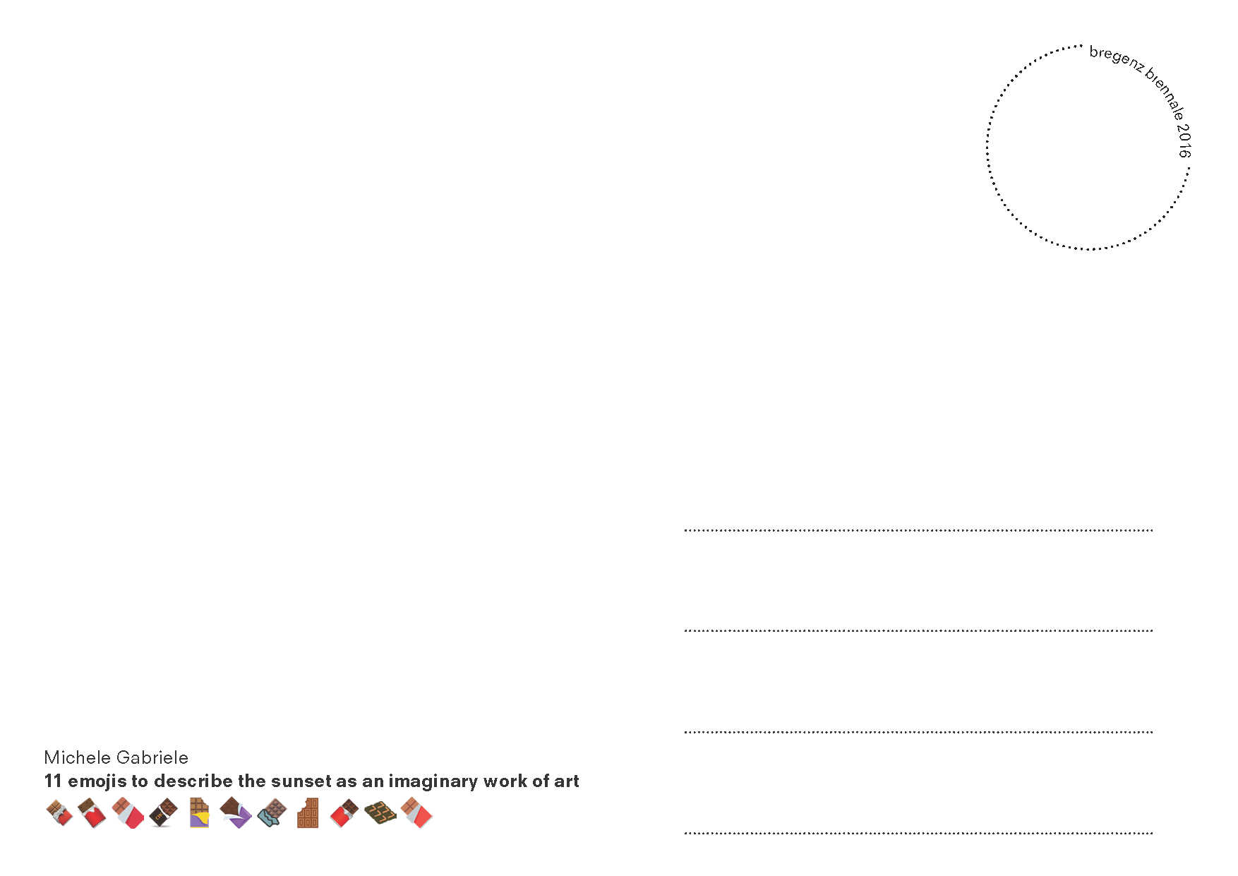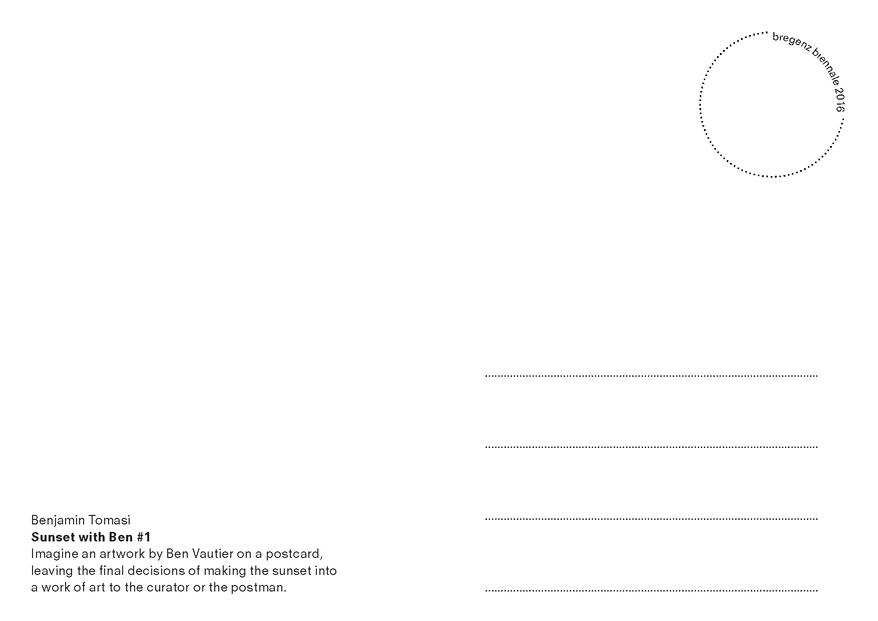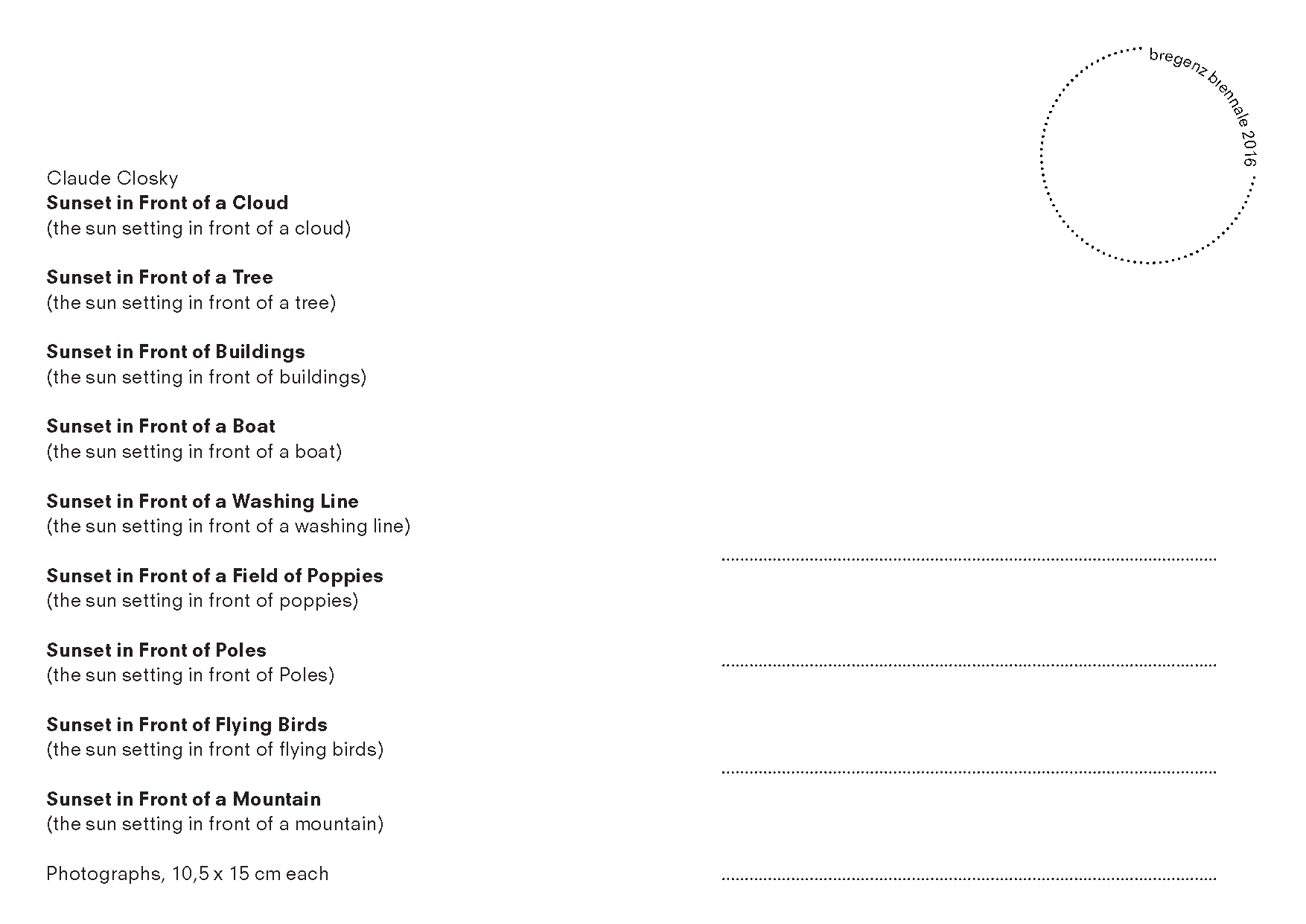 For the Bregenz Biennale 2016 the curators Albert Allgaier & Bernhard Garnicnig chartered an airplane that announced the realization of 29 imaginary and immaterial artworks by Jamie Allen, Simone Borghi, Sean J Patrick Carney, Martin Chramosta, Claude Closky, Constant Dullaart, Fabian Faltin, Karin Ferrari, Alec Finlay, Peter Fritzenwallner, Michele Gabriele, Thomas Geiger, Katharina Höglinger, Barbara Anna Husar, Lisa Kainz, Lital Khaikin, Rick Lins, Romain Mader, Maria Maeser, Fernando Mesquita, Marco Rios, Lina Rukevičiūtė & Lina Zaveckytė, Driton Selmani, Lena Sieder-Semlitsch, Benjamin Tomasi, Gruppe Uno Wien, Noburo Watanabe, Seth Weiner and Arnaud Wohlhauser. They declared the sunset at the Lake Constance seen from Bregenz on the 14th of August 2016 as a work of art. The works are preserved as printed as postcards and are now circulating worldwide. View their digital versions here.