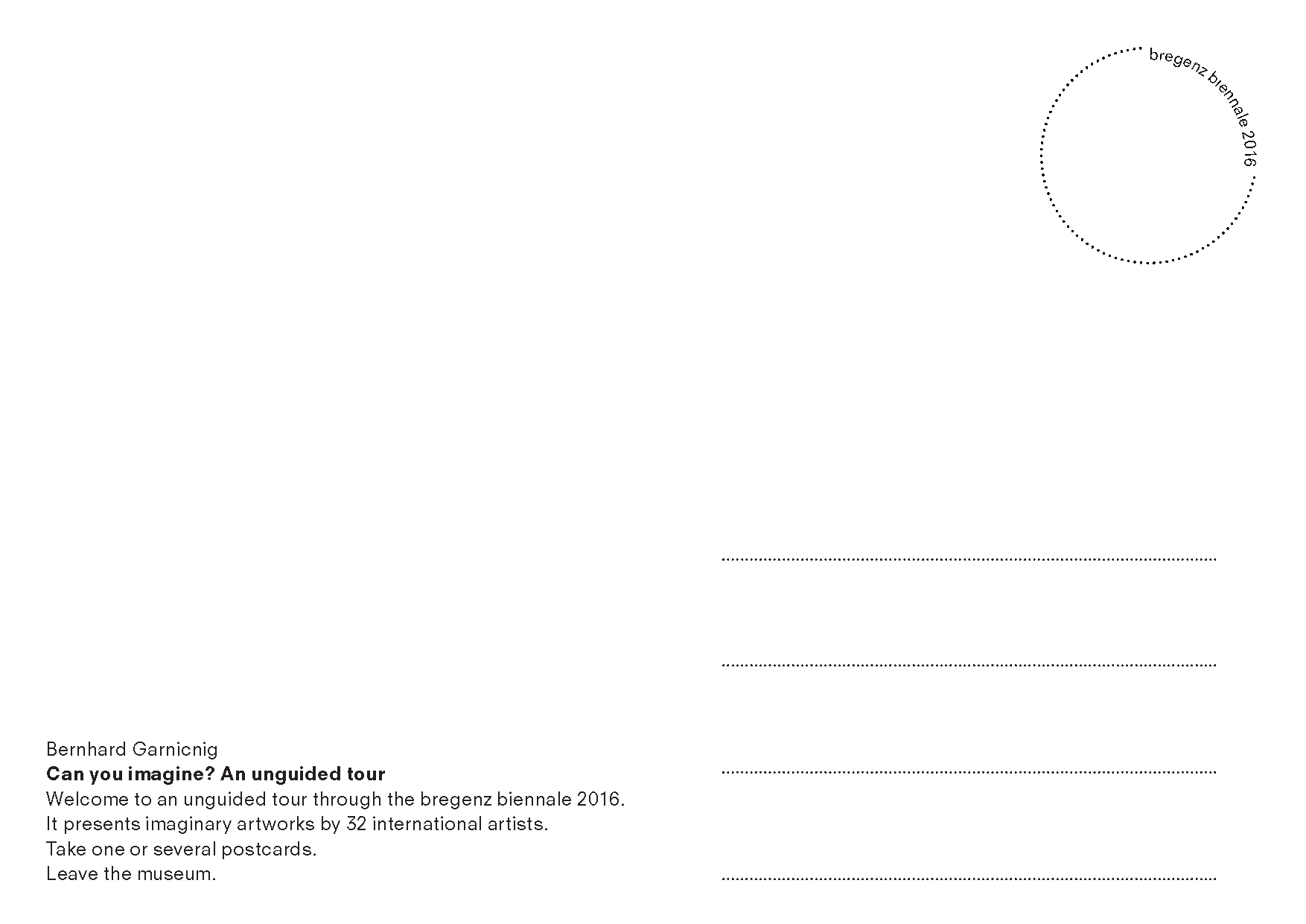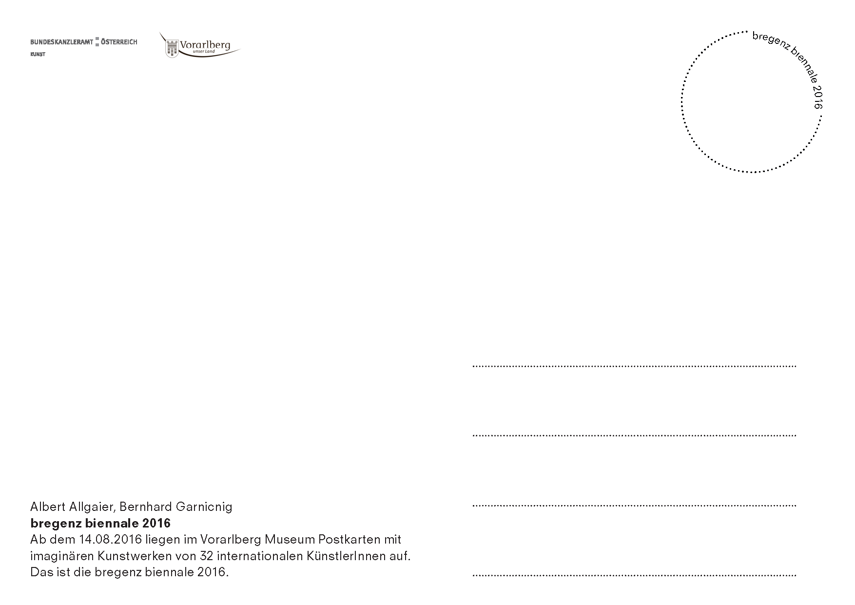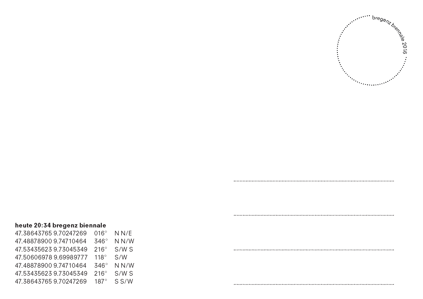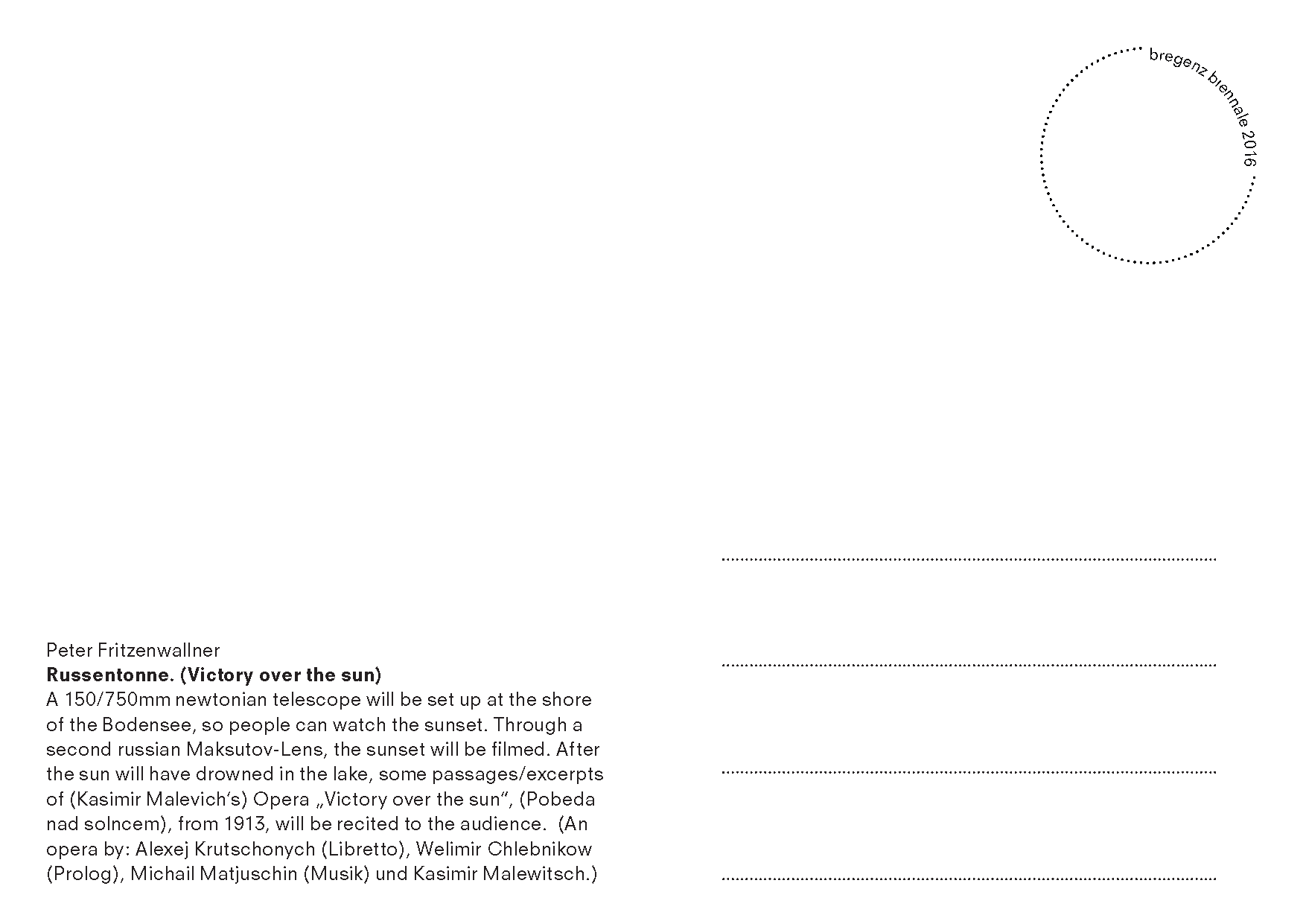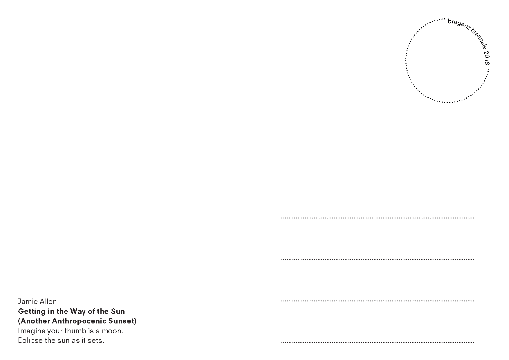 For the Bregenz Biennale 2016 the curators Albert Allgaier & Bernhard Garnicnig chartered an airplane that announced the realization of 29 imaginary and immaterial artworks by Jamie Allen, Simone Borghi, Sean J Patrick Carney, Martin Chramosta, Claude Closky, Constant Dullaart, Fabian Faltin, Karin Ferrari, Alec Finlay, Peter Fritzenwallner, Michele Gabriele, Thomas Geiger, Katharina Höglinger, Barbara Anna Husar, Lisa Kainz, Lital Khaikin, Rick Lins, Romain Mader, Maria Maeser, Fernando Mesquita, Marco Rios, Lina Rukevičiūtė & Lina Zaveckytė, Driton Selmani, Lena Sieder-Semlitsch, Benjamin Tomasi, Gruppe Uno Wien, Noburo Watanabe, Seth Weiner and Arnaud Wohlhauser. They declared the sunset at the Lake Constance seen from Bregenz on the 14th of August 2016 as a work of art. The works are preserved as printed as postcards and are now circulating worldwide. View their digital versions here.