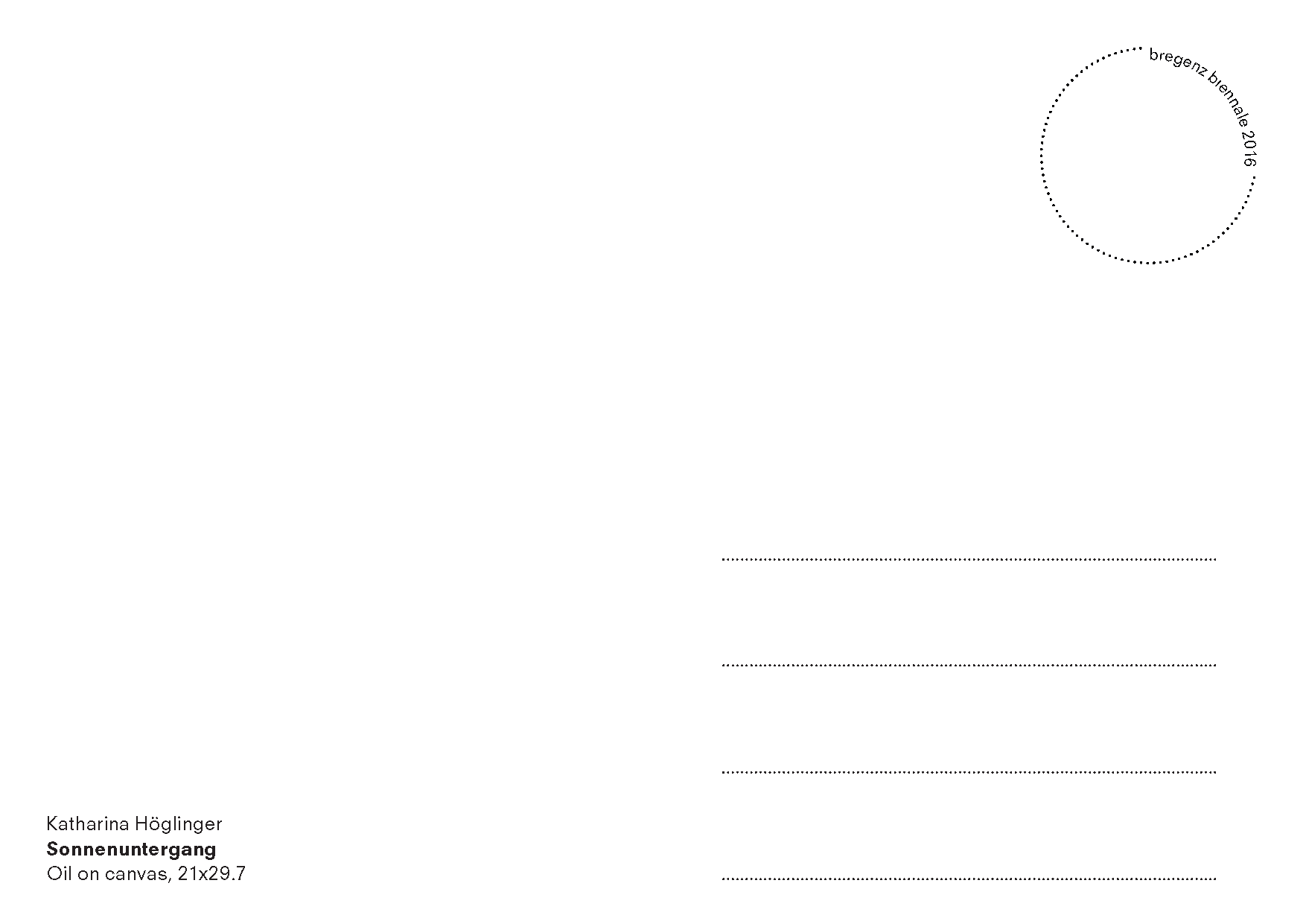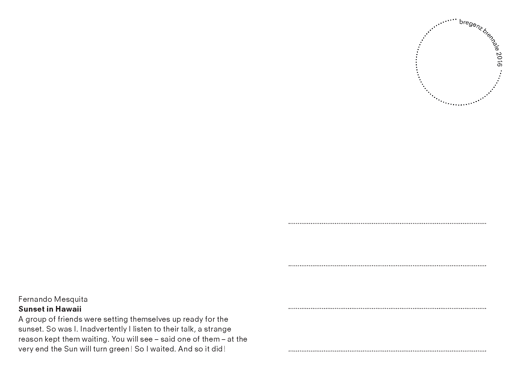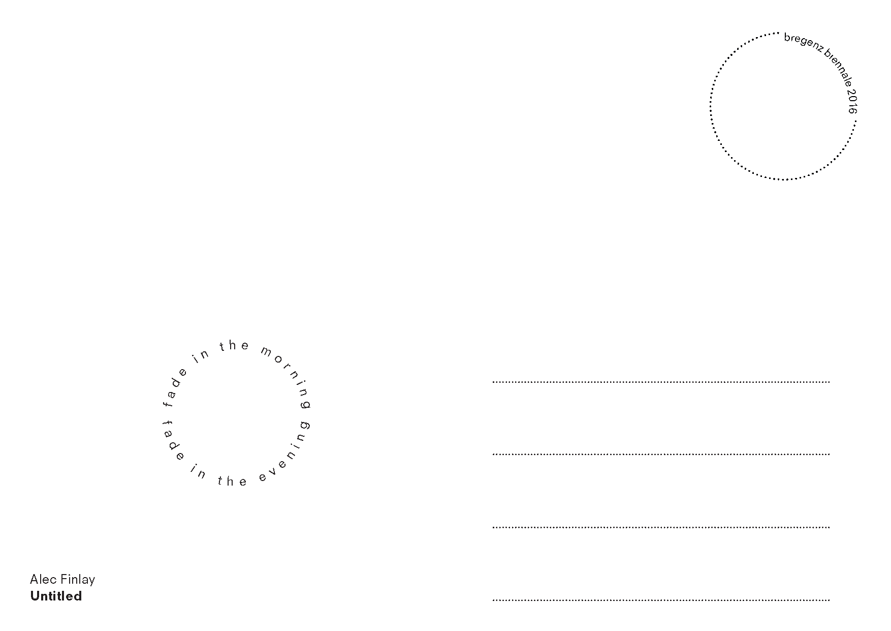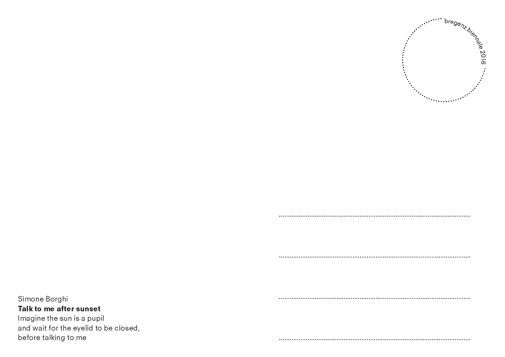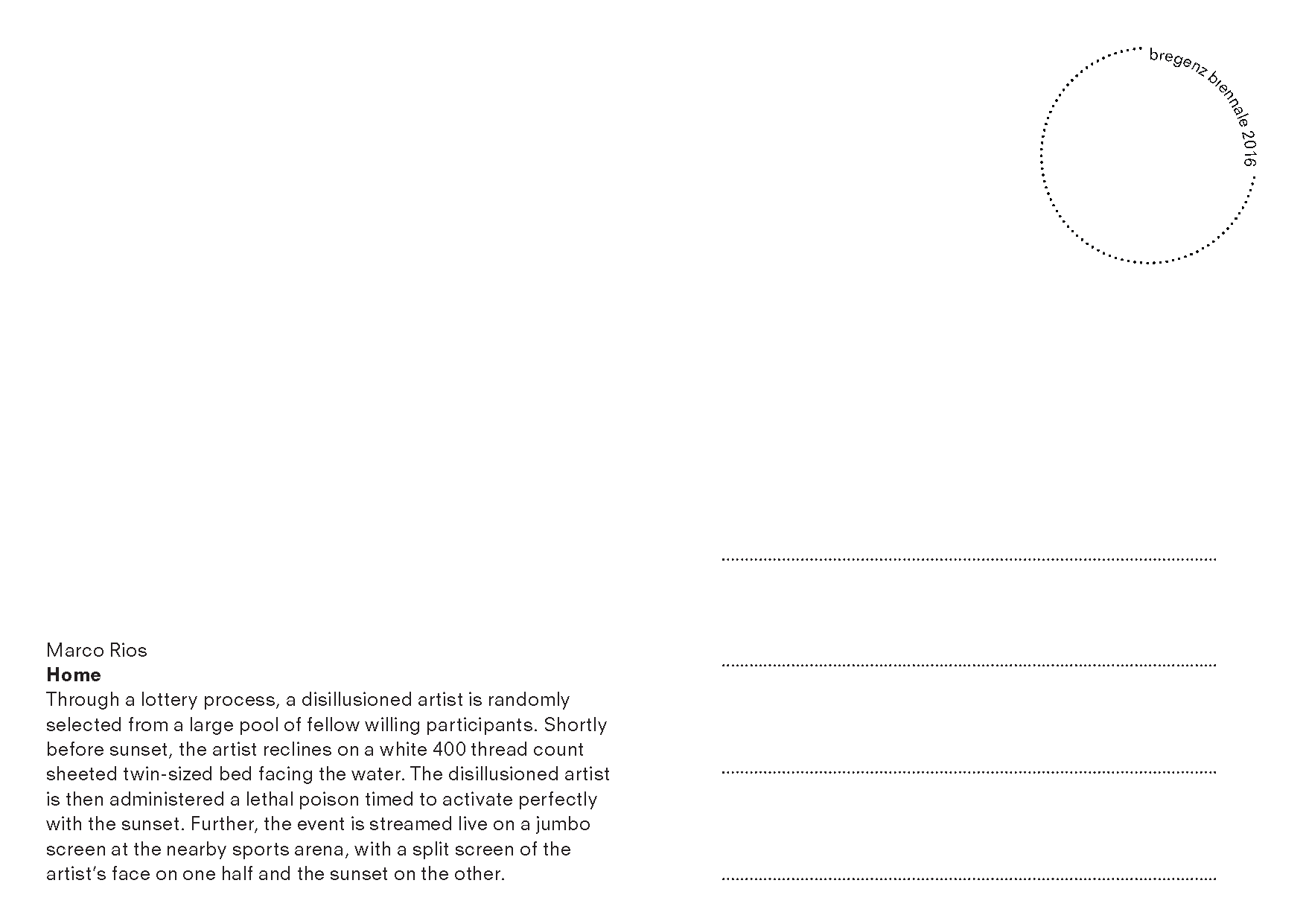 For the Bregenz Biennale 2016 the curators Albert Allgaier & Bernhard Garnicnig chartered an airplane that announced the realization of 29 imaginary and immaterial artworks by Jamie Allen, Simone Borghi, Sean J Patrick Carney, Martin Chramosta, Claude Closky, Constant Dullaart, Fabian Faltin, Karin Ferrari, Alec Finlay, Peter Fritzenwallner, Michele Gabriele, Thomas Geiger, Katharina Höglinger, Barbara Anna Husar, Lisa Kainz, Lital Khaikin, Rick Lins, Romain Mader, Maria Maeser, Fernando Mesquita, Marco Rios, Lina Rukevičiūtė & Lina Zaveckytė, Driton Selmani, Lena Sieder-Semlitsch, Benjamin Tomasi, Gruppe Uno Wien, Noburo Watanabe, Seth Weiner and Arnaud Wohlhauser. They declared the sunset at the Lake Constance seen from Bregenz on the 14th of August 2016 as a work of art. The works are preserved as printed as postcards and are now circulating worldwide. View their digital versions here.