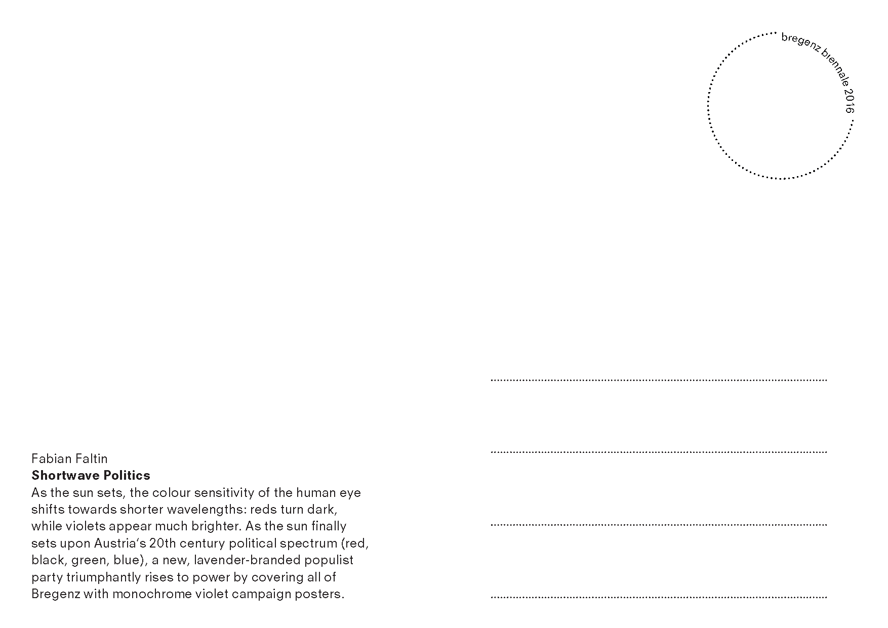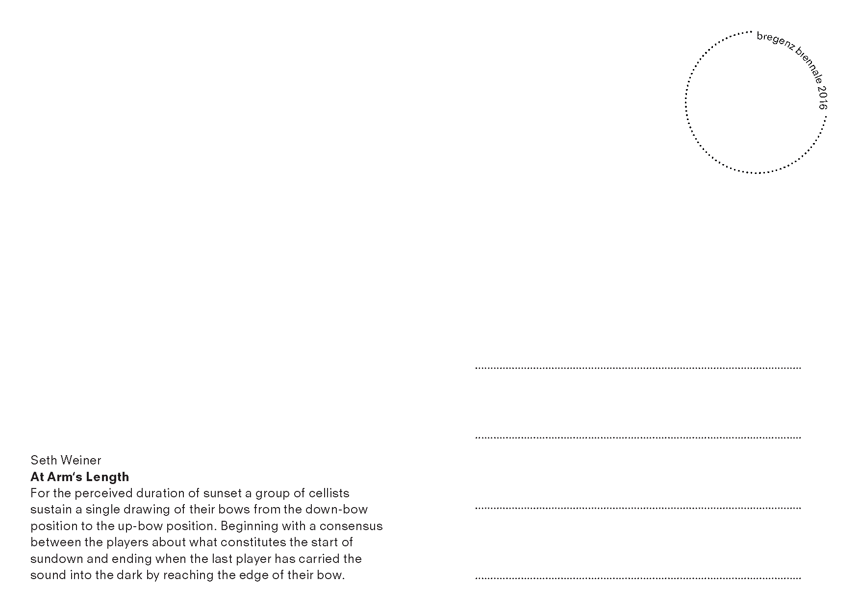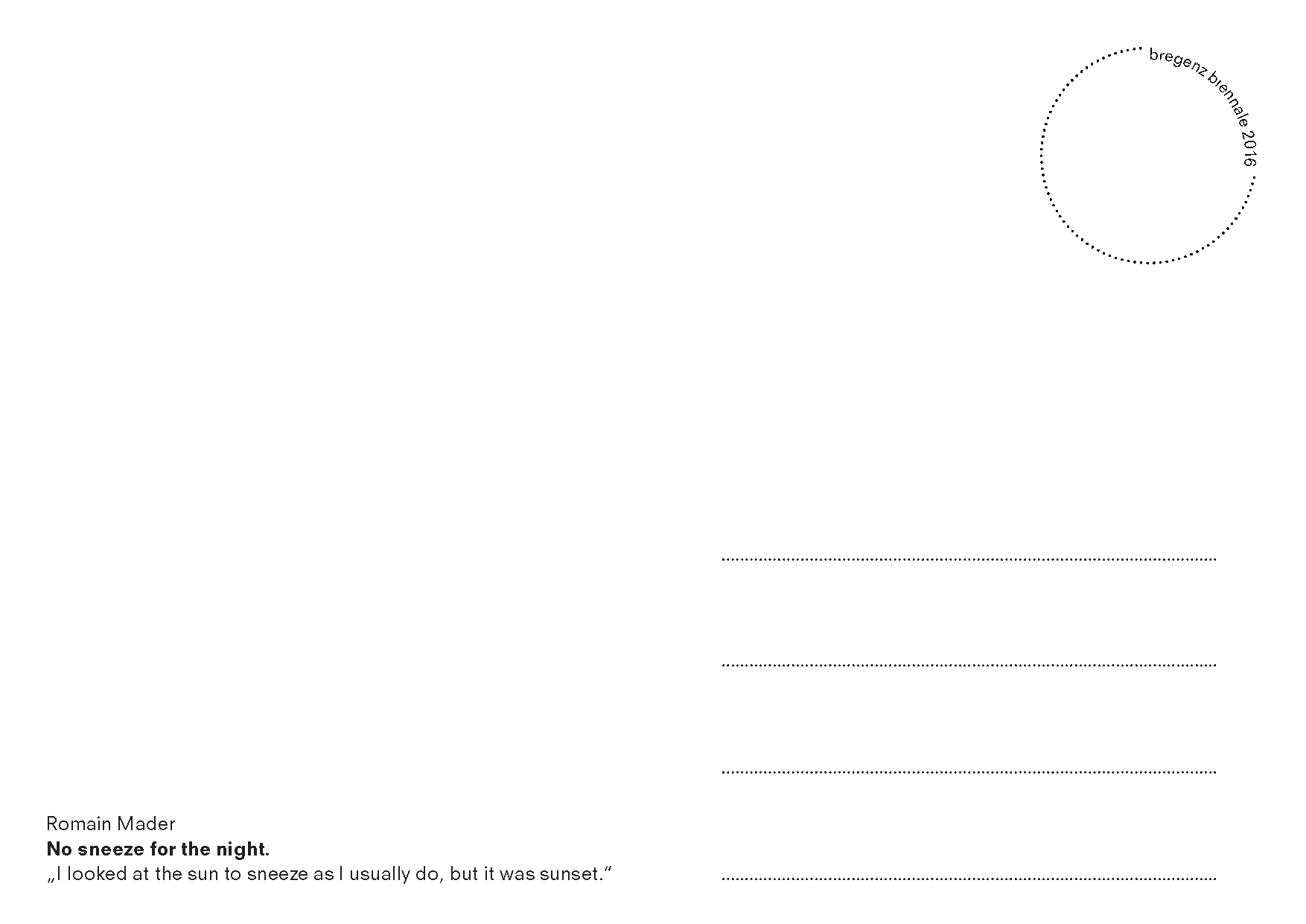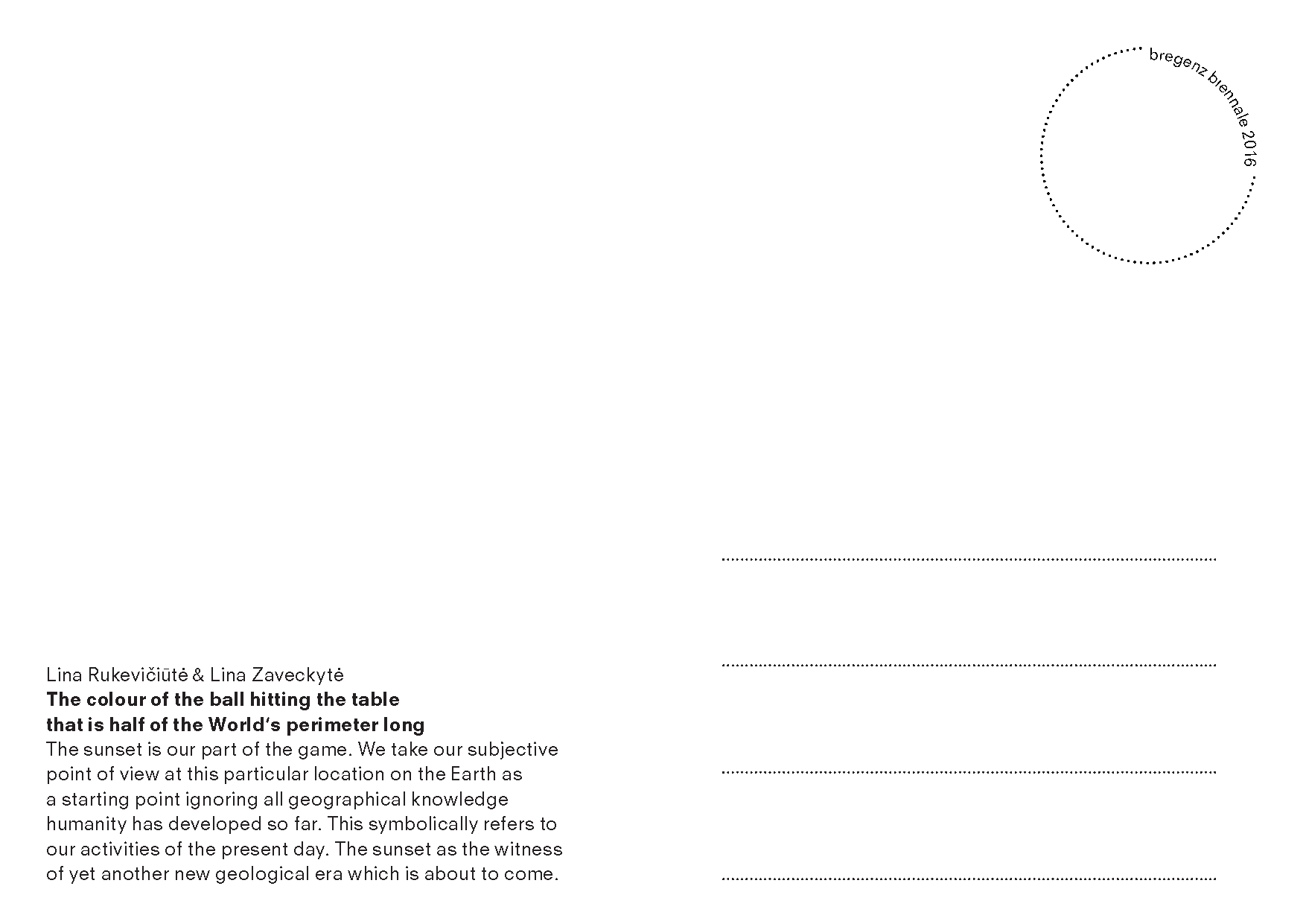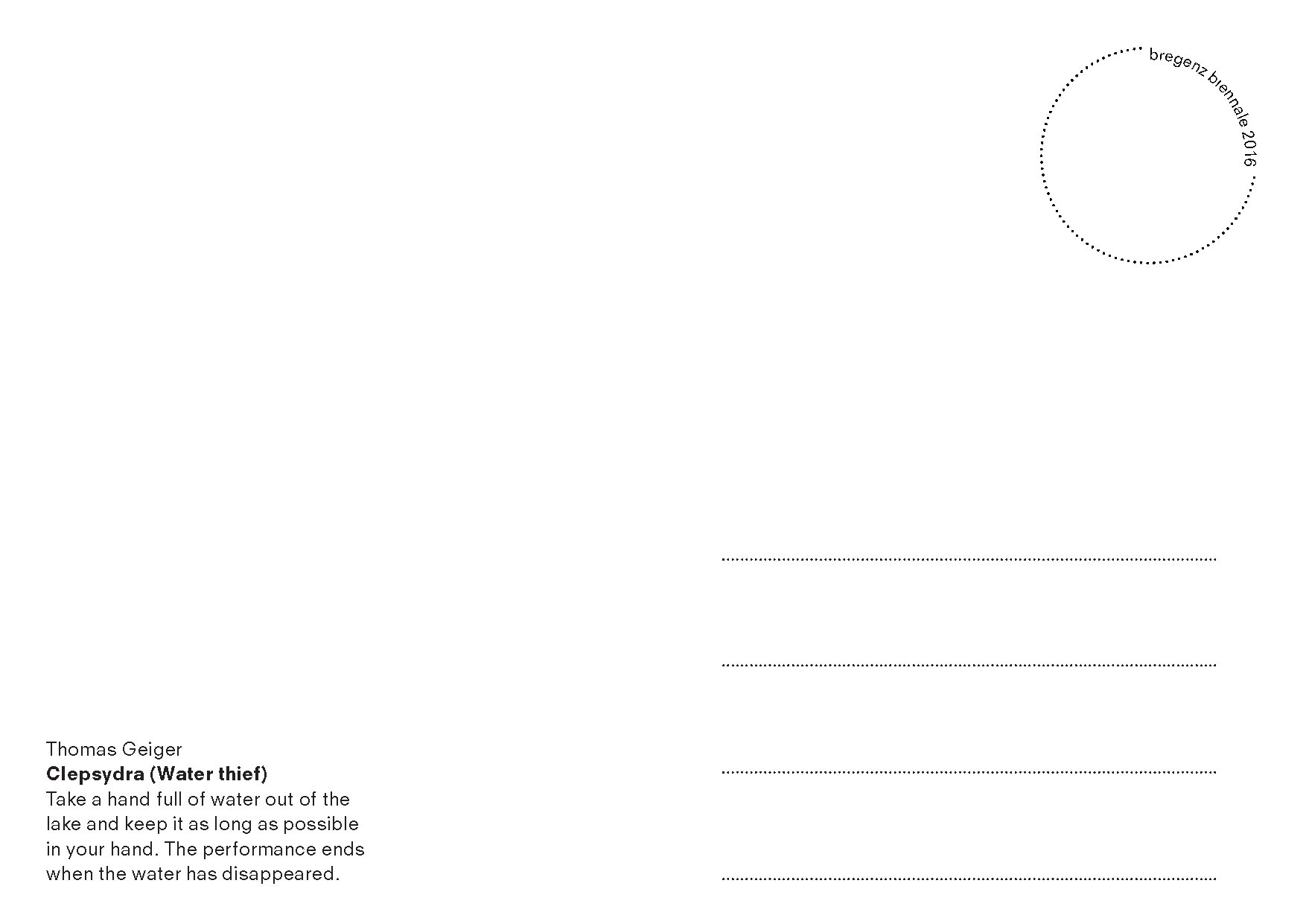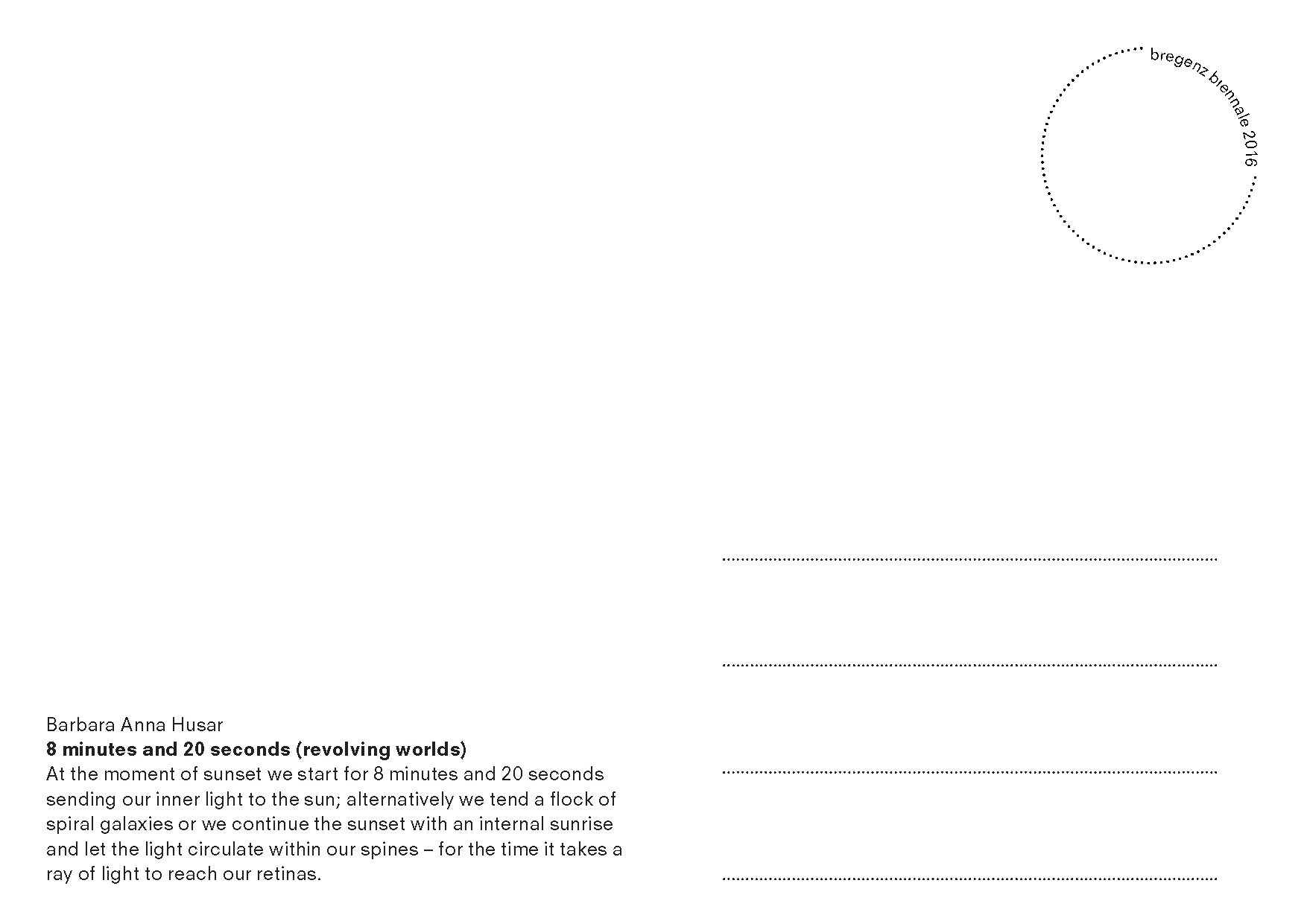 For the Bregenz Biennale 2016 the curators Albert Allgaier & Bernhard Garnicnig chartered an airplane that announced the realization of 29 imaginary and immaterial artworks by Jamie Allen, Simone Borghi, Sean J Patrick Carney, Martin Chramosta, Claude Closky, Constant Dullaart, Fabian Faltin, Karin Ferrari, Alec Finlay, Peter Fritzenwallner, Michele Gabriele, Thomas Geiger, Katharina Höglinger, Barbara Anna Husar, Lisa Kainz, Lital Khaikin, Rick Lins, Romain Mader, Maria Maeser, Fernando Mesquita, Marco Rios, Lina Rukevičiūtė & Lina Zaveckytė, Driton Selmani, Lena Sieder-Semlitsch, Benjamin Tomasi, Gruppe Uno Wien, Noburo Watanabe, Seth Weiner and Arnaud Wohlhauser. They declared the sunset at the Lake Constance seen from Bregenz on the 14th of August 2016 as a work of art. The works are preserved as printed as postcards and are now circulating worldwide. View their digital versions here.