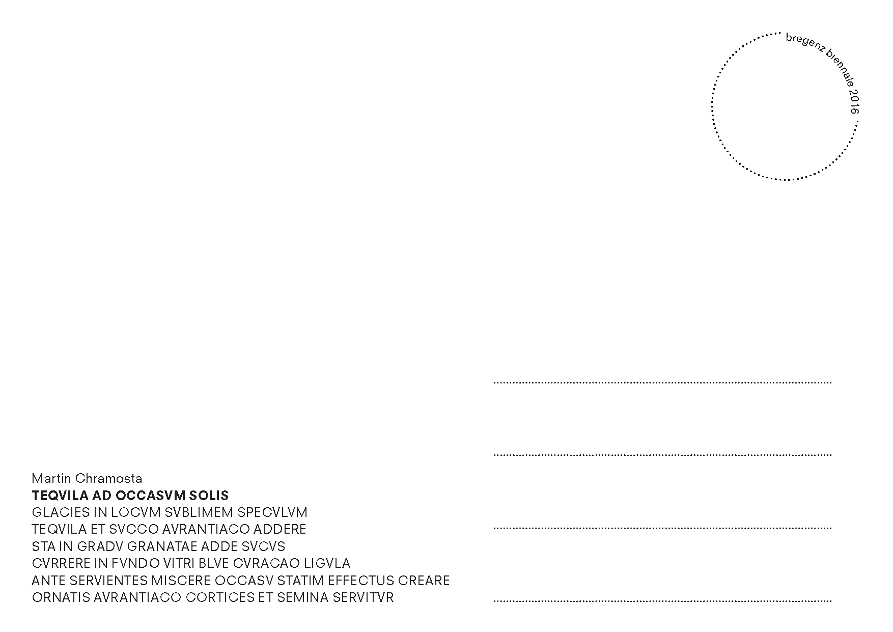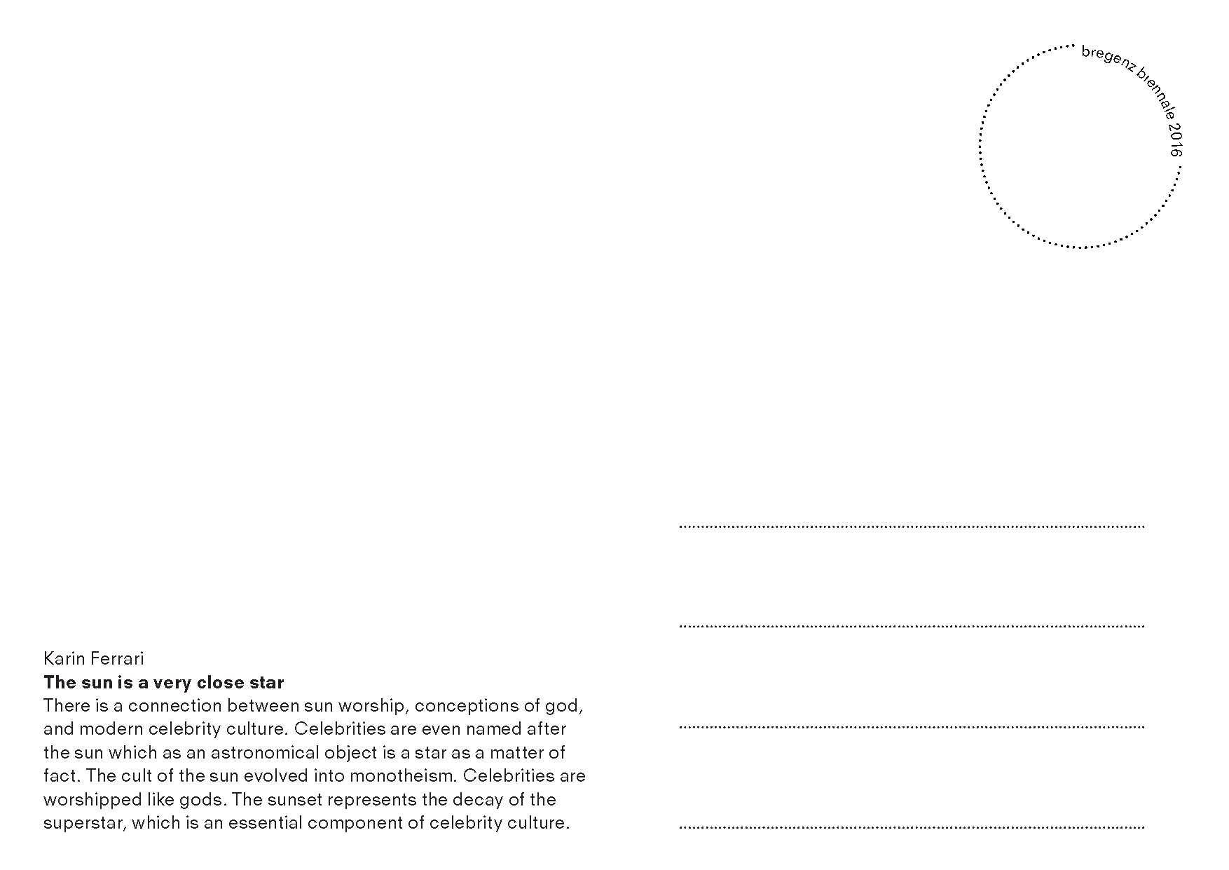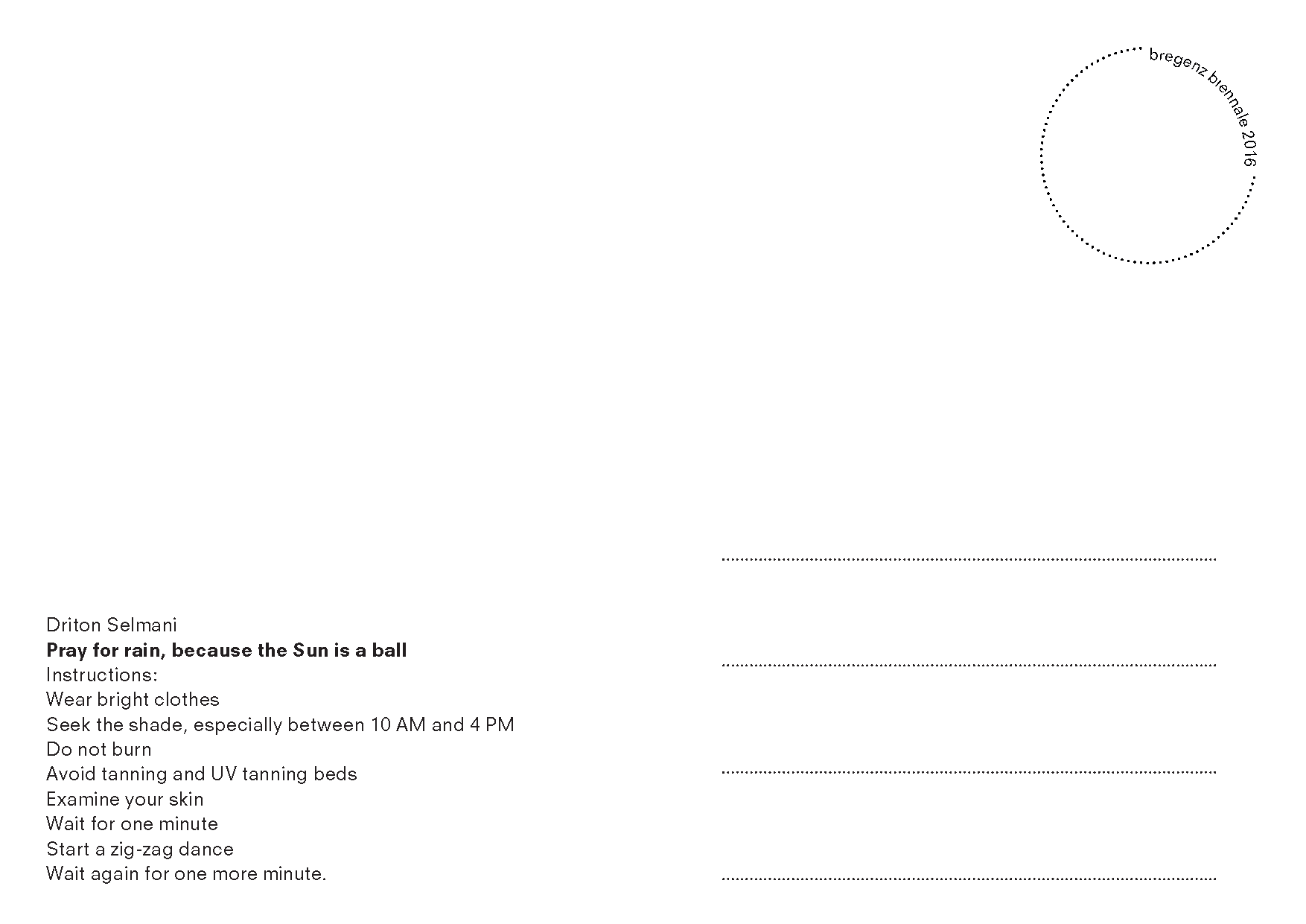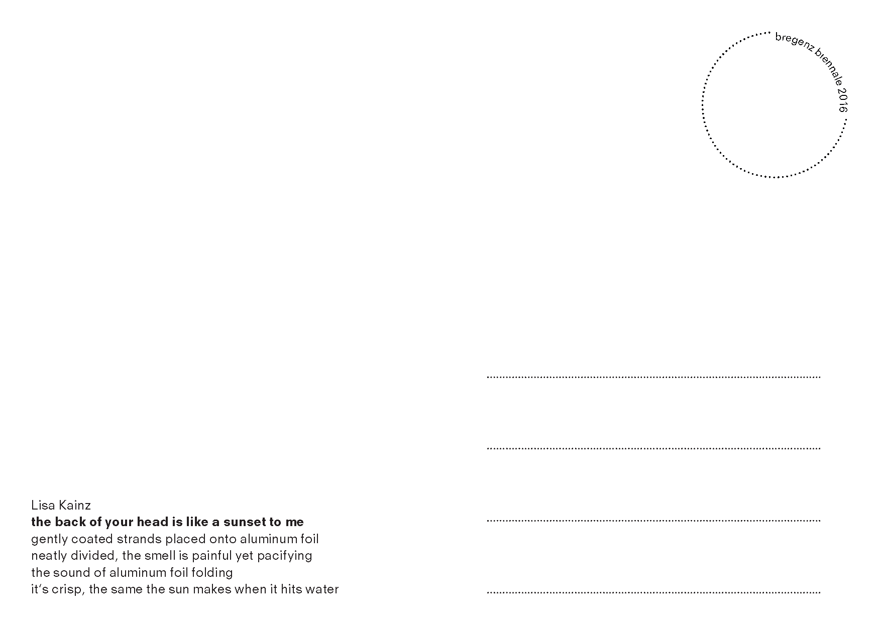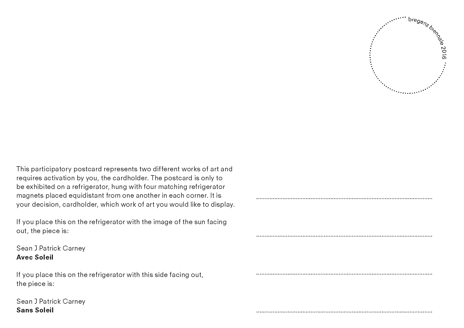 For the Bregenz Biennale 2016 the curators Albert Allgaier & Bernhard Garnicnig chartered an airplane that announced the realization of 29 imaginary and immaterial artworks by Jamie Allen, Simone Borghi, Sean J Patrick Carney, Martin Chramosta, Claude Closky, Constant Dullaart, Fabian Faltin, Karin Ferrari, Alec Finlay, Peter Fritzenwallner, Michele Gabriele, Thomas Geiger, Katharina Höglinger, Barbara Anna Husar, Lisa Kainz, Lital Khaikin, Rick Lins, Romain Mader, Maria Maeser, Fernando Mesquita, Marco Rios, Lina Rukevičiūtė & Lina Zaveckytė, Driton Selmani, Lena Sieder-Semlitsch, Benjamin Tomasi, Gruppe Uno Wien, Noburo Watanabe, Seth Weiner and Arnaud Wohlhauser. They declared the sunset at the Lake Constance seen from Bregenz on the 14th of August 2016 as a work of art. The works are preserved as printed as postcards and are now circulating worldwide. View their digital versions here.