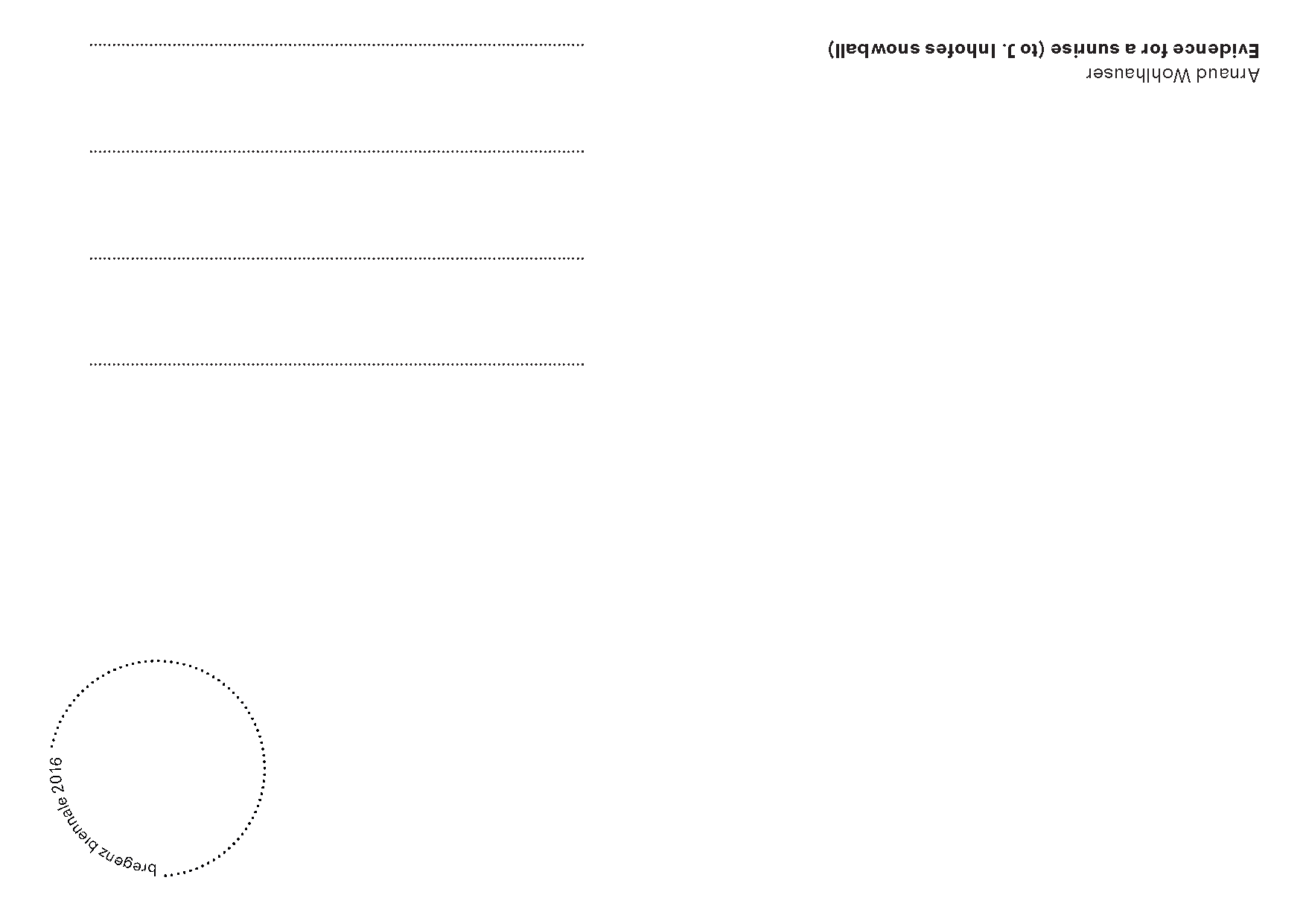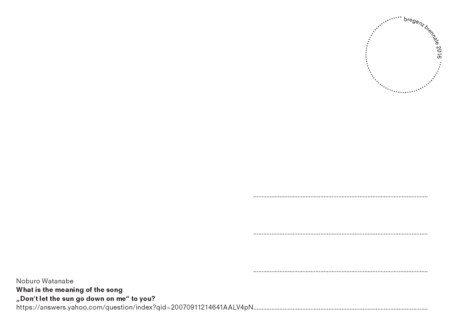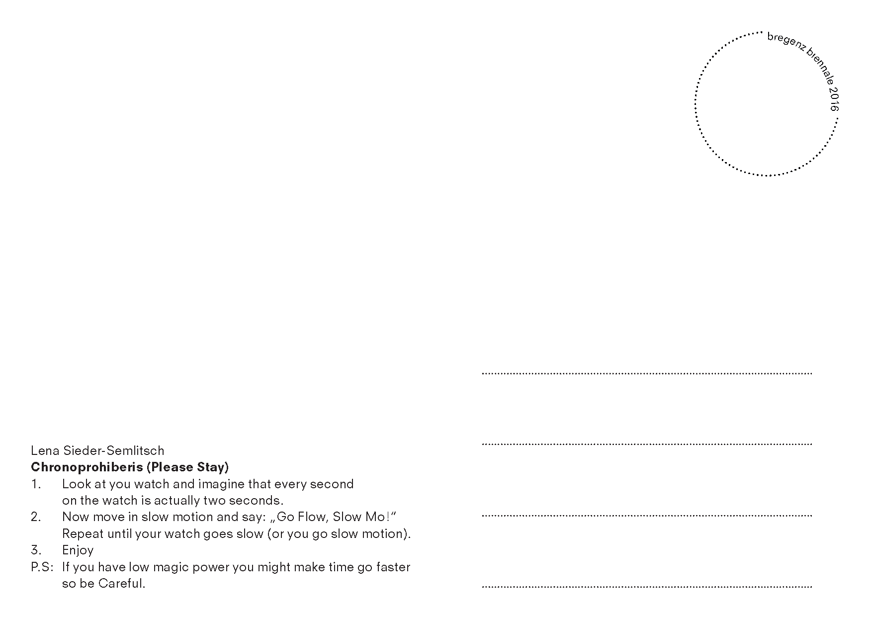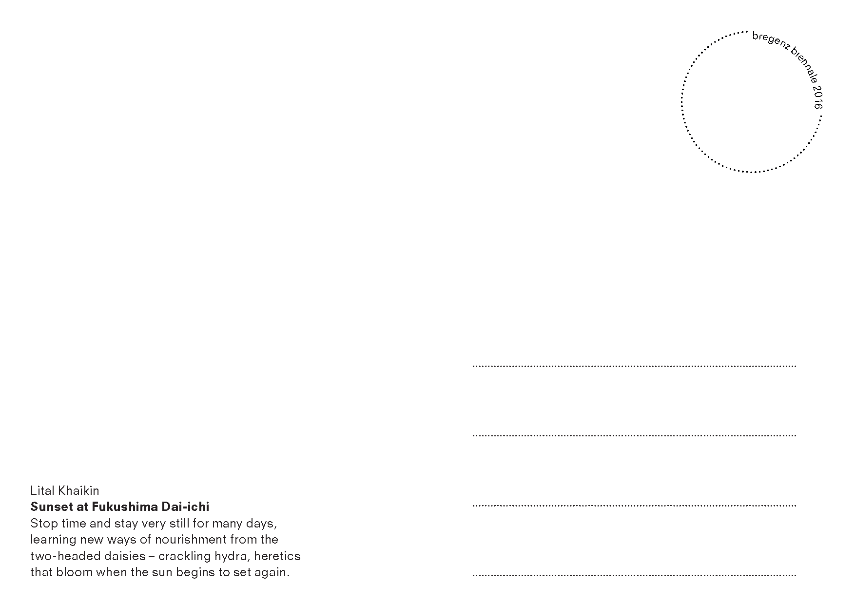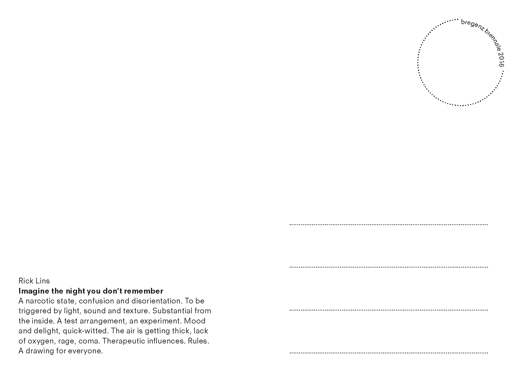 For the Bregenz Biennale 2016 the curators Albert Allgaier & Bernhard Garnicnig chartered an airplane that announced the realization of 29 imaginary and immaterial artworks by Jamie Allen, Simone Borghi, Sean J Patrick Carney, Martin Chramosta, Claude Closky, Constant Dullaart, Fabian Faltin, Karin Ferrari, Alec Finlay, Peter Fritzenwallner, Michele Gabriele, Thomas Geiger, Katharina Höglinger, Barbara Anna Husar, Lisa Kainz, Lital Khaikin, Rick Lins, Romain Mader, Maria Maeser, Fernando Mesquita, Marco Rios, Lina Rukevičiūtė & Lina Zaveckytė, Driton Selmani, Lena Sieder-Semlitsch, Benjamin Tomasi, Gruppe Uno Wien, Noburo Watanabe, Seth Weiner and Arnaud Wohlhauser. They declared the sunset at the Lake Constance seen from Bregenz on the 14th of August 2016 as a work of art. The works are preserved as printed as postcards and are now circulating worldwide. View their digital versions here.
